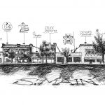 Architecture may draw her eye, but it’s not the only thing she’s concerned with in her images. She says, “I like to be honest about a place. I’ll chose my own angles and perspective, and if it feels authentic, I’ll make sketches to note my emotions.” Her favorite drawing so far depicts grain elevators in a field in the middle of nowhere, but she considers the subject pure.